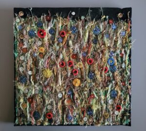 « Champ de fleurs » réalisé en 2020 – art textile sur support contreplaqué